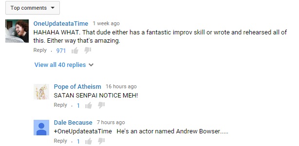 At this point I was sure this guy was playing a character… and was also a freakin’ genius! I had to find out who he was… I started scrolling through the comments on Youtube, and bam! There it was!