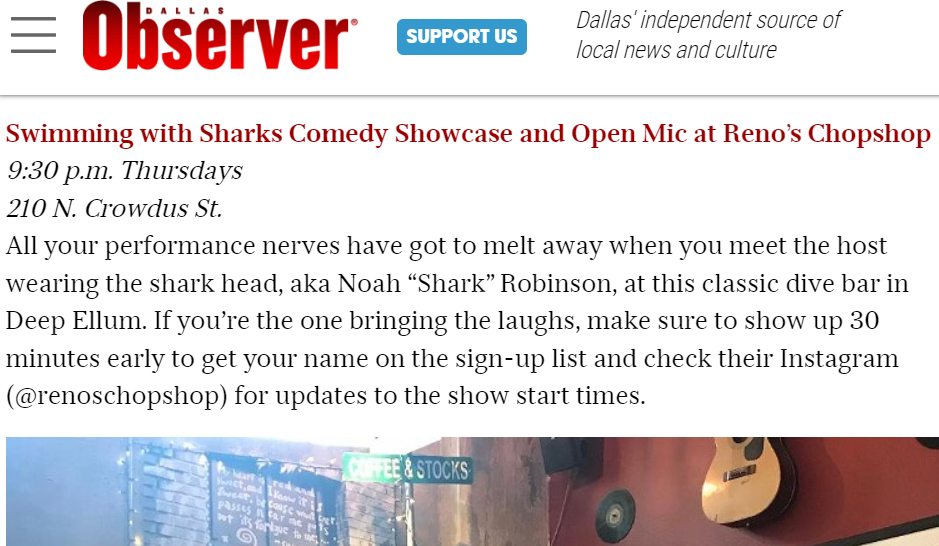 All your performance nerves have got to melt away when you meet the host wearing the shark head, aka Noah “Shark” Robinson, at this classic dive bar in Deep Ellum. If you’re the one bringing the laughs, make sure to show up 30 minutes early to get your name on the sign-up list and check their Instagram (@renoschopshop) for updates to the show start times.”