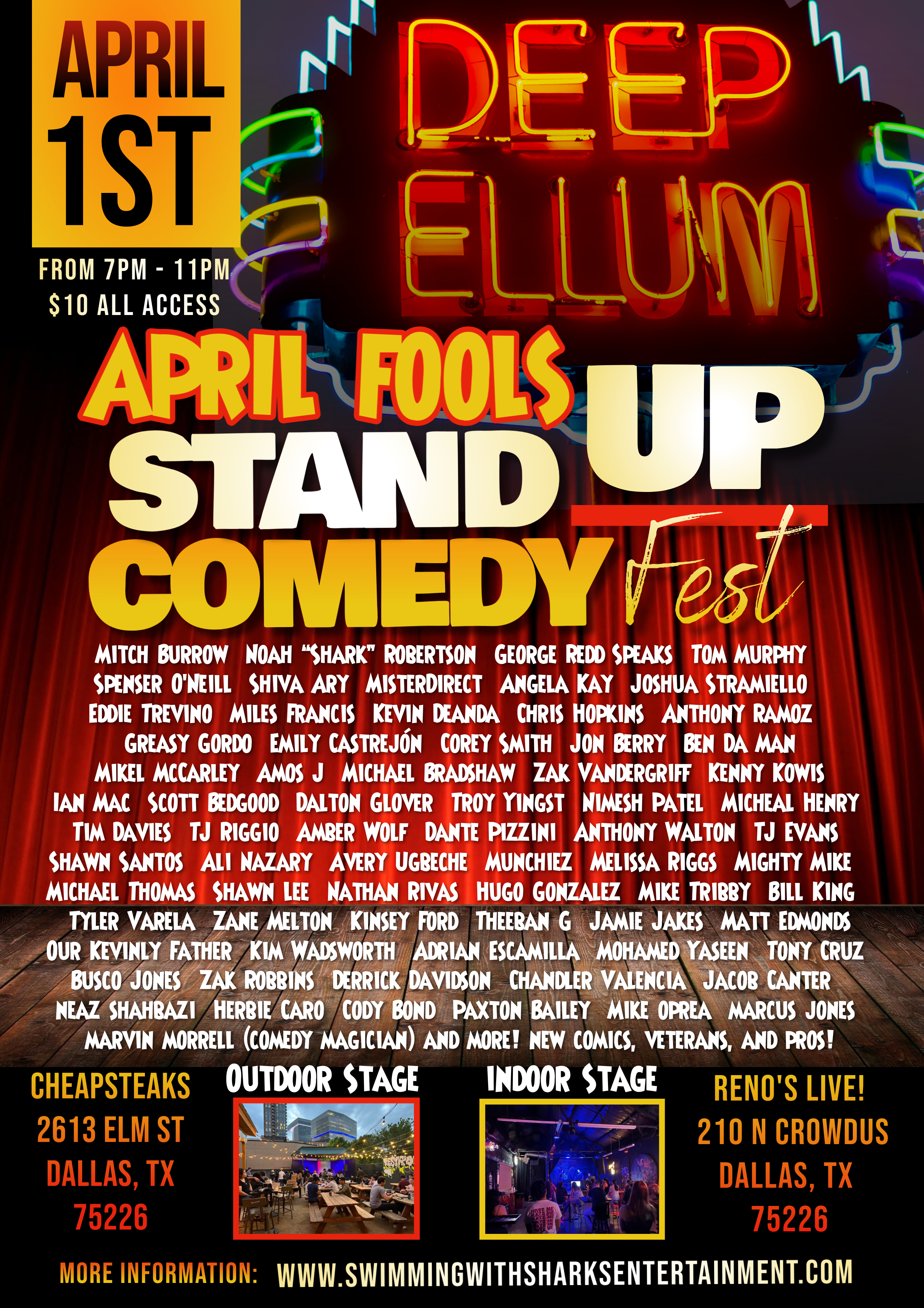 Swimming with Sharks Entertainment presents APRIL FOOLS COMEDY FEST featuring stand-up comics from DFW and all over Texas… and beyond! Taking place at 2 Venues on 2 Stages! One ticket gives you access to BOTH stages!
