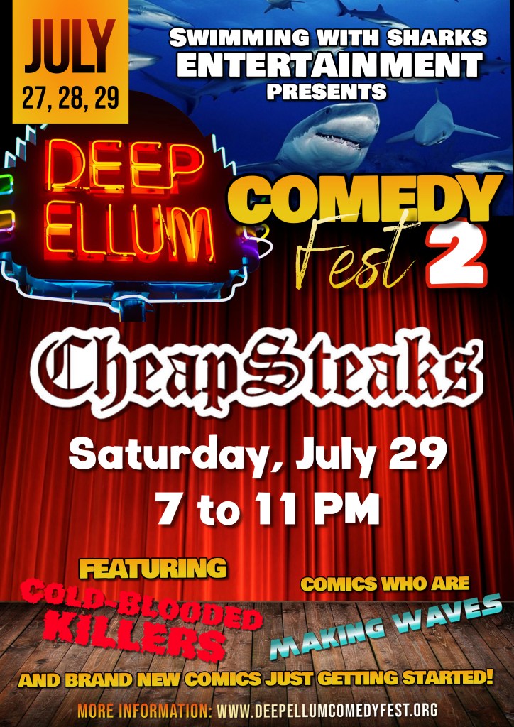 Come party with us at CheapSteaks in Deep Ellum! 4 hours of stand-up comedy, food, live music, and more!
